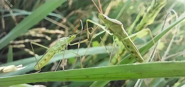 மயிலாடுதுறை மாவட்டம் சீர்காழி அருகே கீரங்குடி கிராமத்தில் சம்பா நெற்பயிர்கள் சுமார் 10 ஆயிரம் ஏக்கரில் பயிரப்பட்டுள்ளது. கடந்த புயல் மழையால் கீரங்குடி கிராமத்தில் தெற்கு ராஜன் வாய்க்கால் உடைப்பால் கிராமம் முழுவதும் வெள்ளநீர் சூழ்ந்து விவசாயம் முழுவதும் தண்ணீரில் மூழ்கி அழிந்த நிலையில் சுமார் ஆயிரம் ஏக்கர் விவசாய நிலங்களில் பாதிப்பிலிருந்து தப்பித்து தற்போது அறுவடைக்கு தயாராக உள்ள நிலையில் வட மாநிலத்தில் வெட்டுகிளிகள் விவசாயத்தை அளித்தது போல கீரங்குடி கிராமத்தில் உள்ள நெற்பயிர்களில் லட்ச கணக்கில் வெட்டுகிளிகள் படையெடுத்து நெற்பயிர்களை கடித்து நாசம் செய்து வருவதால் நெல் மணிகள் அனைத்தும் பதறாகி வருவதால் விவசாயிகள் கவலை அடைந்துள்ளனர்.