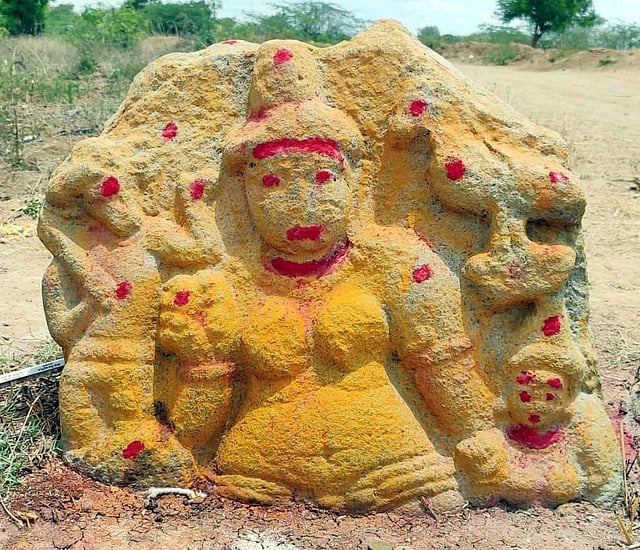 எங்களது கள ஆய்வில் கிடைத்த இச்சிலையானது ஒன்றரை அடி உயரமே வெளியில் தெரியும் வகையில் இருக்கிறது. எஞ்சிய பகுதி பூமிக்கடியில் புதைந்த நிலையில் காணப்படுகிறது. இது 1200 ஆண்டுகளுக்கு முற்பட்ட பல்லவர் காலத்தை சேர்ந்த ஜேஷ்டாதேவி சிலையாகும். இச்சிலையின் வலப்பக்கத்தில் மாட்டுத்தலை போன்ற வடிவில் அவரது மகன் மாந்தனும், இடப்பக்கம் மகள் மாந்தியும் காணப்படுகின்றனர்.