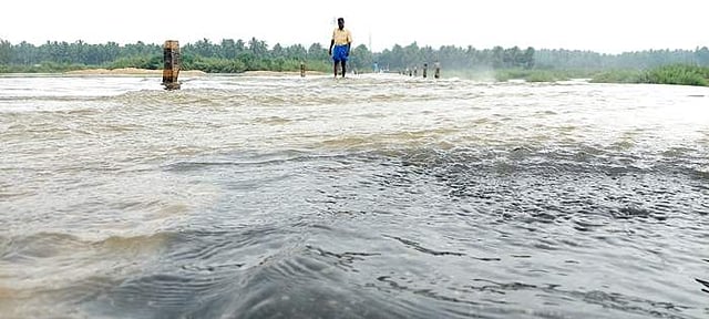 மாண்டஸ் புயல் காரணமாக திருப்பத்தூர் மாவட்டத்தில் தொடர்ந்து கடந்து மூன்று நாட்களாக பெய்து வரும் தொடர் மழையாலும், ஆம்பூர் வாணியம்பாடி அருகே தமிழக ஆந்திர எல்லைப் பகுதிகளில் உள்ள நீர்ப்பிடிப்பு பகுதியில் பெய்து வரும் கனமழையால் ஆம்பூர் அடுத்த பச்சகுப்பம் பகுதியில் ஆம்பூர் - குடியாத்தம் செல்லும் சாலையை இணைக்கும் பாலாற்று தரைப்பாலத்தை வெள்ளம் பெருக்கெடுத்து பாலாற்று தரைப்பாலம் முழ்கடித்த நிலையில் வெள்ளம் சென்று கொண்டிருக்கிறது.