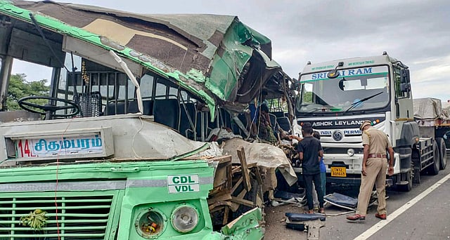 சென்னை - திருச்சி தேசிய நெடுஞ்சாலையில் மதுராந்தகம் அச்சரப்பாகம் அடுத்த தொழுப்பேடு அருகே சென்னையில் இருந்து சிதம்பரம் நோக்கிச் சென்று கொண்டிருந்த அரசுப் பேருந்து ஓட்டுநரின் கட்டுப்பாட்டை இழந்து சாலையில் நின்றுகொண்டிருந்து கண்டெய்னர் லாரி மீது மோதி விபத்துக்குள்ளானது. இதில், பேருந்தில் இருந்து பயணிகளில் 2 பெண்கள் உள்பட 6 பேர் சம்பவ இடத்திலேயே பலியாகினர். 10க்கும் மேற்பட்டோர் காயமடைந்தனர்.