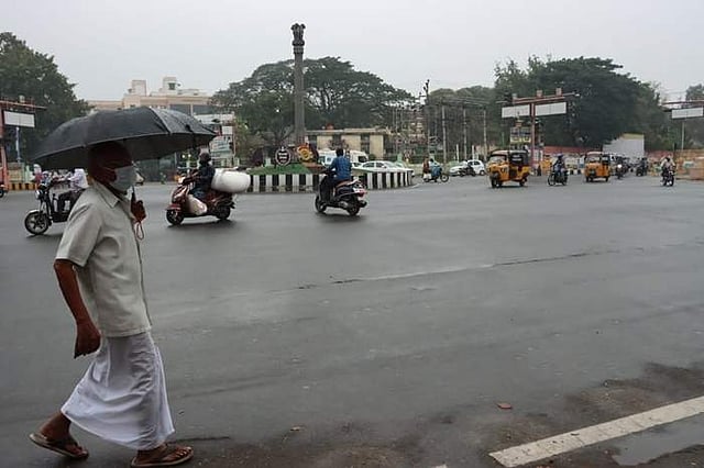 சாரல் மழையில் குடை பிடித்தப்படி மிதிவண்டி ஓட்டுச் செல்லும் முதியவர்