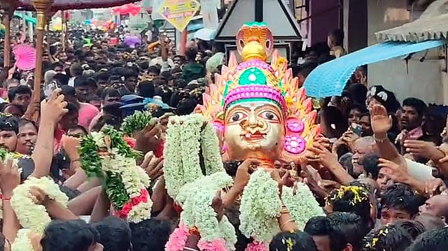 இதையொட்டி, குடியாத்தம் தரணம்பேட்டை முத்தியாலம்மன் கோயிலில் இருந்து, சிலம்பாட்டம், மயிலாட்டம், புலியாட்டம், கரகாட்டம் உள்ளிட்ட பாரம்பரிய கலை நிகழ்ச்சிகளுடன், பம்பை, உடுக்கை, மேள தாளம் முழங்க, அம்மன் சிரசு ஊர்வலமாக கொண்டு செல்லப்பட்டது.