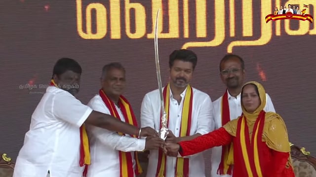 தவெக மாநாட்டு மேடையில் அதன் தலைவர் விஜய்க்கு வீரவாள் பரிசளிக்கப்பட்டது.