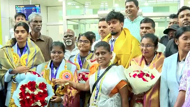 இவா்கள் மூவரும் விமான மூலம் ஞாயிற்றுக்கிழமை இரவு சென்னை வந்தடைந்தனா். அவா்களுக்கு தமிழ்நாடு விளையாட்டு மேம்பாட்டு ஆணையம் மற்றும் அவா்களின் பெற்றோா் மற்றும் உறவினா்கள் சாா்பில் சென்னை விமான நிலையத்தில் உற்சாக வரவேற்பு அளிக்கப்பட்டது.