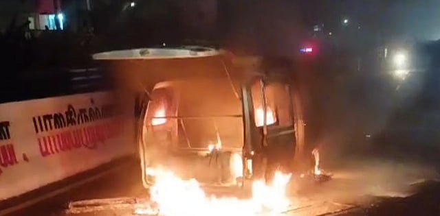 வாழப்பாடி அருகே மேட்டுப்பட்டி சுங்கச்சாவடி மேம்பால பகுதியில் சேலம் நோக்கிச் சென்ற ஆம்னி வேன் தீப்பிடித்து எரிந்தது.