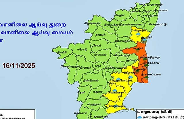 நவம்பர் 16 அன்று கடலூர், மயிலாடுதுறை, திருவாரூர், நாகப்பட்டினம் மற்றும் காரைக்கால் மாவட்டங்களில் ஓரிரு இடங்களில் கன முதல் மிக கனமழையும்,