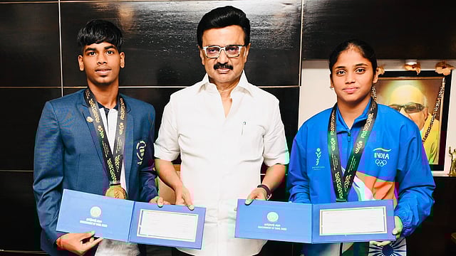 ஆசிய இளையோர் விளையாட்டு போட்டியில் தங்கம் வென்ற கார்த்திகா, அபினேஷ்க்கு முதல்வர் ஸ்டாலின் தலா ரூ.25 லட்சம் ஊக்கத் தொகை வழங்கி பாராட்டினார்.