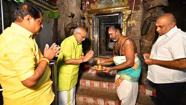 மாலை 6.45 மணி அளவில் அம்மன் சன்னதி வழியாக கோவிலுக்குள் சென்ற குடியரசுத் துணைத் தலைவர் சி.பி. ராதாகிருஷ்ணனுடன் பாஜகவின் மாநில தலைவர் நயினார் நாகேந்திரன் சென்றார்.