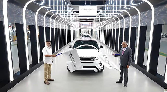டாடா நிறுவன கார் ஆலையை தொடங்கிவைத்து ரேஞ்ச் ரோவர் காரை முதல்வர் ஸ்டாலின் ஓட்டினார். காரை முதல்வர் ஓட்டிய நிலையில் டாடா குழும தலைவர் சந்திரசேகரன் முன் சீட்டில் அமர்ந்திருந்தார்.