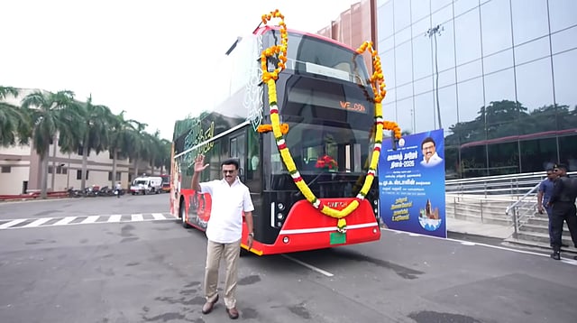 வெளிநாடு வாழ் தமிழர்கள் ரூ.1.8 கோடி மதிப்பிலான டபுள் டெக்கர் பேருந்தை அரசிடம் கொடுத்தனர். சென்னையில் சுற்றுலாத் துறை சார்பில் இயக்கப்படவிருக்கும் டபுள் டெக்கர் பேருந்து சேவையை முதல்வர் ஸ்டாலின் இன்று தொடக்கி வைத்து, பேருந்தை சுற்றிப் பார்த்தார்.