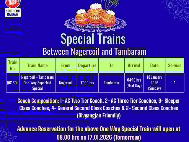 ஜன.18ஆம் தேதி நாகர்கோயில் - தாம்பரம் இடையே ஒரு வழிப் பாதையில் தெற்கு ரயில்வே இயக்கும் இந்த சிறப்பு ரயிலானது, நாகர்கோயிலில் இருந்து மாலை 5 மணிக்கு புறப்படும். இது ஜன. 19-ஆம் தேதி காலை 4.10 மணிக்கு தாம்பரம் வந்தடையும் என்று அறிவிக்கப்பட்டுள்ளது.