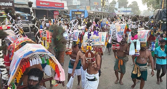 சர்க்கரை காவடியுடன் ஆயிரக்கணக்கான பக்தர்கள் கடந்த ஜன. 26-ல் குன்றக்குடியில் இருந்து 21 நாள்கள் பயணமாக புறப்பட்டு நத்தம் வழியாக பழனியை நோக்கி பயணத்தை மேற்கொள்கின்றனர்.