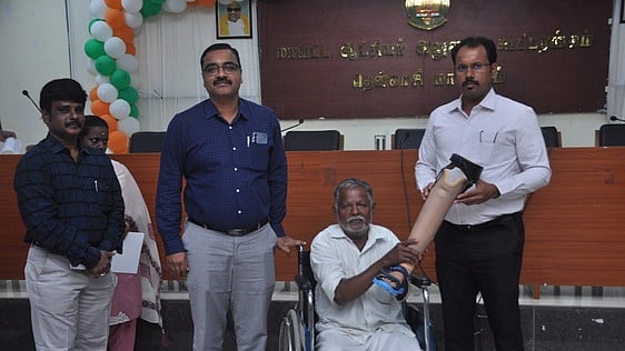 மாற்றுத் திறனாளிகள் நலத் துறை சாா்பில், உதவி உபகரணங்கள் வழங்கும் திட்டத்தின்கீழ் ஒருவருக்கு செயற்கைக் கால்களை ஆட்சியா் வழங்கினாா்.