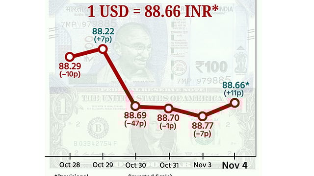 வங்கிகளுக்கு இடையேயான அந்நியச் செலாவணியில், இந்திய ரூபாய் மதிப்பு ரூ.88.55ஆக தொடங்கி, அதன் இன்ட்ரா-டே வர்த்தகத்தில் அதிகபட்சமாக ரூ.88.28 ஐ எட்டியது. வர்த்தக முடிவில் டாலருக்கு நிகராக அதன் குறைந்தபட்ச அளவான ரூ.88.67 தொட்ட நிலையில், ரூ.88.66 ஆக நிலைபெற்றது. இது அதன் முந்தைய இறுதி நிலையை விட 11 காசுகள் அதிகரிப்பு.