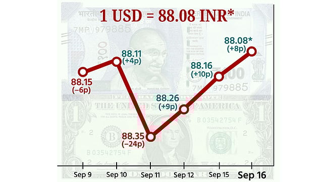 நேற்று (திங்கள்கிழமை) அமெரிக்க டாலருக்கு நிகரான இந்திய ரூபாய் மதிப்பு 10 காசுகள் உயர்ந்து ரூ.88.16 ஆக நிலைபெற்றது.