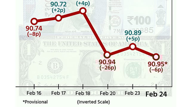 வங்கிகளுக்கு இடையேயான அந்நியச் செலாவணி சந்தையில், இந்திய ரிசர்வ் வங்கியின் தலையீடு காரணமாக, ரூபாய் மதிப்பு ரூ. 90.91 ஆக தொடங்கி பிறகு ரூ. 90.91 முதல் ரூ.90.97 என்ற குறுகிய வரம்பில் வர்த்தகமானது. பிறகு இது அதன் முந்தைய முடிவிலிருந்து 6 காசுகள் குறைந்து ரூ. 90.95 ஆக நிலைபெற்றது.