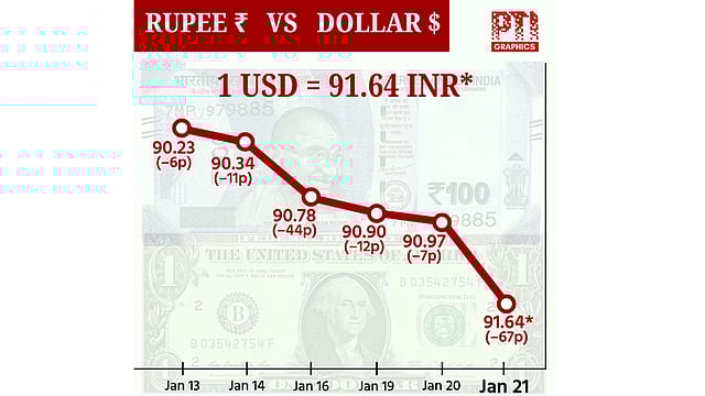 மும்பை: உலகச் சந்தைகளில் அதிகரித்த நிச்சயமற்ற தன்மை மற்றும் தொடர்ந்து வெளியேறி வரும் வெளிநாட்டு நிதி உள்ளிட்டவையால் இன்றைய வர்த்தகத்தில் டாலருக்கு நிகரான இந்திய ரூபாய் மதிப்பு 67 காசுகள் சரிந்து, இதுவரை இல்லாத குறைந்தபட்ச அளவான ரூ.91.64ஆக நிலைபெற்றது.