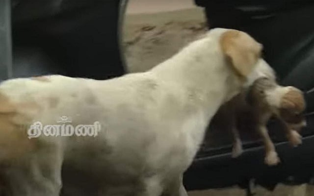 கொட்டும் மழையில் குட்டிகளை காப்பாற்றிய நாய்! காரில் அடிபட்டு இரு குட்டிகள் இறந்ததால் சோகம்!
