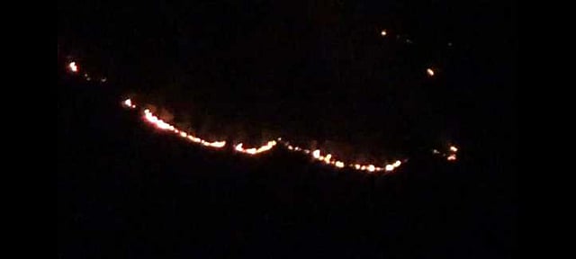 வத்திராயிருப்பு பிளவக்கல் அணை அருகேயுள்ள மேற்கு தொடா்ச்சி மலைப் பகுதியில் திங்கள்கிழமை இரவு காட்டுத் தீ பற்றி எரிந்து வருகிறது.
