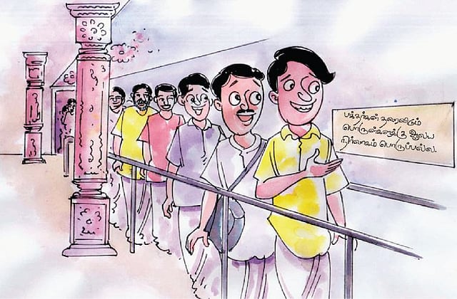 'பக்தர்கள் தவற விடும் பொருள்களுக்கு ஆலய நிர்வாகம் பொறுப்பன்று' எனத் திருத்தி எழுதுங்கள் என்று எழுதிக் கொடுத்து வந்தோம். திருத்தி எழுதியிருப்பார்களா?