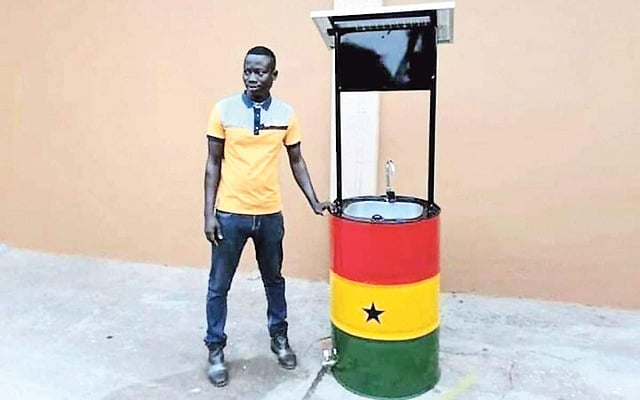 கடைகளுக்கோ, அலுவலகங்களுக்கோ சென்றால், கைகளில் சானிடைசரை ஊற்றி தூய்மைப்படுத்தச் சொல்கிறார்கள். பெரிய நிறுவனங்கள், அலுவலகங்களில் திரவ சோப்பை கை கழுவும் இடத்தில் வைத்திருக்கிறார்கள். திரவ சோப்பைக் கைகளில் தடவி, தண்ணீர்க்குழாய்களைத் திறந்து கை கழுவிக் கொள்கிறோம். குழாய்களைத் திறக்கும்போது கையில் உள்ள வைரஸ் குழாயில் ஒட்டிக் கொண்டால், அடுத்து கை கழுவ குழாயைத் திறப்பவரின் கையில் அது ஒட்டி தொற்றிக் கொள்ளும் வாய்ப்பு இருக்கிறது. அலுவலகங்களில் பெரிய நிறுவனங்களில் உள்ள இந்த வசதியை, கட்டட வசதி இல்லாத பொது இடங்களில் ஏற்படுத்த முடியாது. இவற்றுக்குத் தீர்வு காணும்விதமாக ஆப்ரிக்காவின் கானா நாட்டைச் சேர்ந்த ரிச்சர்ட் க்வார்டெங்க் ஏனிங் என்ற மாணவர் ஒரு கை கழுவும் கருவியை ஏற்படுத்தியிருக்கிறார்.