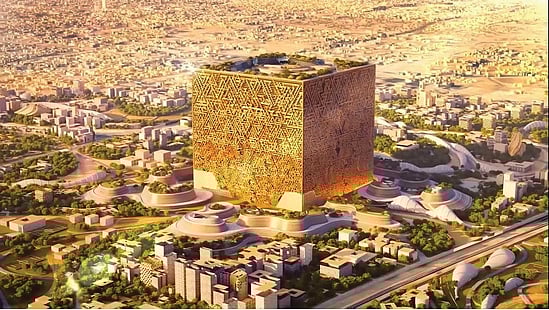 தலைநகரான ரியாத்தில் மையத்தில் 400 மீட்டர் நீள, அகல, உயரம் கொண்ட கன சதுர வடிவ கட்டிடமான 'தி முகாப்' பிரம்மாண்டமாக கட்டப்படும் என்று அறிவித்துள்ளது. 'தி முகாப்' கட்டி முடிக்கப்பட்டால், அது உலகின் மிகப்பெரிய கட்டமைப்பாக மாறும். இந்த வானளாவிய கட்டடம், நியூயார்க்கின் சின்னமான எம்பயர் ஸ்டேட் கட்டடத்தை போல் இருபது மடங்கு இட வசதியாக, இருபது லட்சம் சதுர மீட்டர் பரப்பளவைக் கொண்டிருக்கும்.