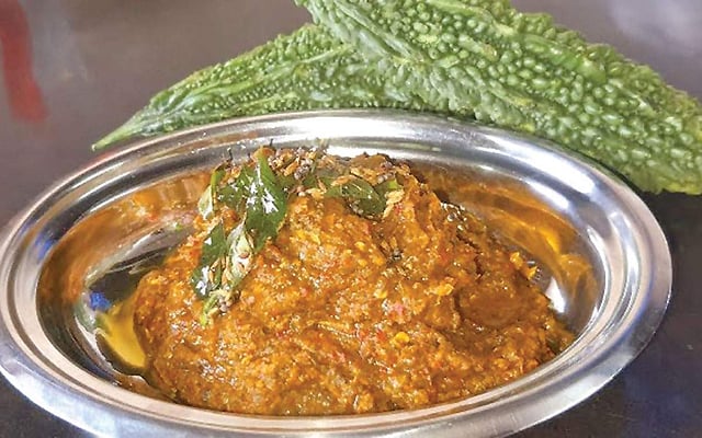 விதையை நீக்கி பாகற்காயை நறுக்கிக் கொள்ளவும். வாணலியில் எண்ணெய்விட்டு சூடு ஆனதும், உளுந்து, சீரகம், காய்ந்த மிளகாய் போட்டு வதக்கவும். பின், பாகற்காயை சேர்த்து வதக்கி ஆற விடவும். வதக்கிய பொருட்களுடன் புளி, வெல்லம் சேர்த்து, தண்ணீர்விட்டு கெட்டியாக அரைக்கவும். அத்துடன் கடுகு. உளுந்தம் பருப்பு, கடலைப்பருப்பு, கறிவேப்பிலை, ஆகியவற்றைத் தாளித்து சேர்த்து தட்டில் பரிமாறவும்.