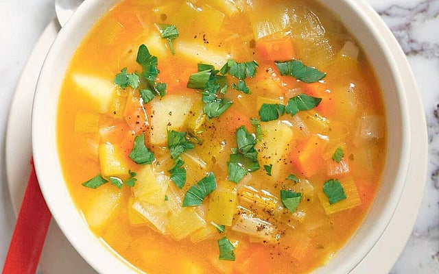 பாசிப்பருப்புடன் மஞ்சள் தூள், போதுமான அளவு தண்ணீர் சேர்த்து, குக்கரில் குழைய வேக வைக்கவும். கேரட், உருளைக்கிழங்கு, வெங்காயம், தக்காளி, பச்சை மிளகாயைப் பொடியாக நறுக்கிக் கொள்ளவும்.