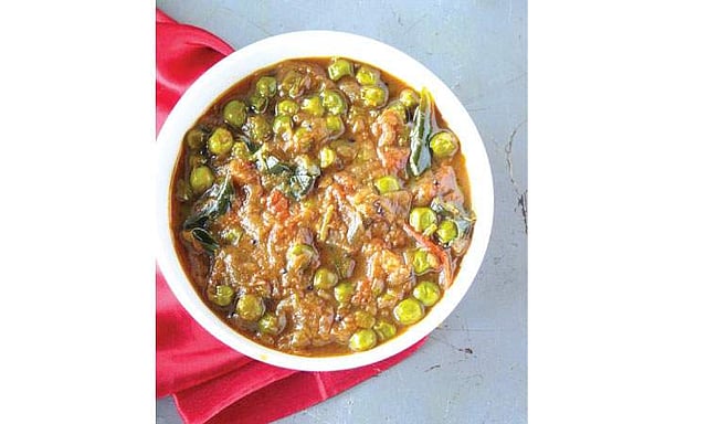 தேங்காய்த் துருவல், காய்ந்த மிளகாய், மிளகு, சீரகம், தனியா இவைகளை எண்ணெய்யில் வறுத்து அரைத்துக் கொள்ளவும். வெங்காயம், தக்காளியை நறுக்கவும். புளியை ஊற வைத்து புளிச்சாறு எடுத்துக் கொள்ளவும். குக்கரில் எண்ணெய் மூன்று தேக்கரண்டி விட்டு கடுகு தாளித்து பொரிந்ததும், வெங்காயம் சேர்த்து சிவக்க வதக்கவும். பிறகு பட்டாணியைச் சேர்த்து ஒரு நிமிடம் வதக்கவும். பிறகு அரைத்த விழுதுச் சேர்த்துக் கிளறி புளிச்சாறு, உப்பு, வெல்லம், தக்காளி இவற்றைச் சேர்த்துக் கிளறி போதுமான தண்ணீர்விட்டு குக்கரை மூடி ஒரு விசில் விட்டு வேக வைத்து இறக்கவும். இதை சப்பாத்திக்கு தொட்டுக் கொள்ளலாம்.
