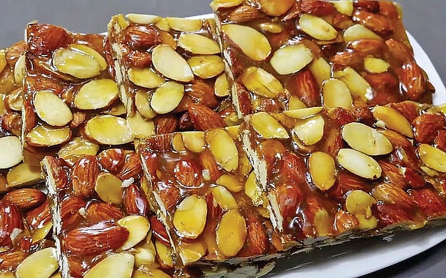 பாதாம் பருப்பை வெந்நீரில் ஊற வைத்துத் தோல் உரித்து பால் சேர்த்து அரைக்க வேண்டும். வாணலியில் தேவையான நீர்விட்டு அடுப்பில் வைத்து சர்க்கரை சேர்த்து பாகு பதம் வந்ததும் அரைத்த பாதாம் விழுது பாகு சேர்த்துக் கிளற வேண்டும். கலவை கெட்டிப் பட்டதும் எஸன்ஸ் சில துளிகள் விட்டுக் கிளற வேண்டும். ஒரு தேக்கரண்டியால் சிறிதளவு எடுத்துப் பார்த்து உருட்ட வரும் பக்குவத்தில் இருந்த மீதி நெய் முழுவதையும் நெய்யைவிட்டுக் கிளறி இறக்க வேண்டும். நெய் தடவிய டிரேவில் கெட்டி சமமாகப் பரப்பி பர்ப்பித் துண்டுகள் போட வேண்டும்.