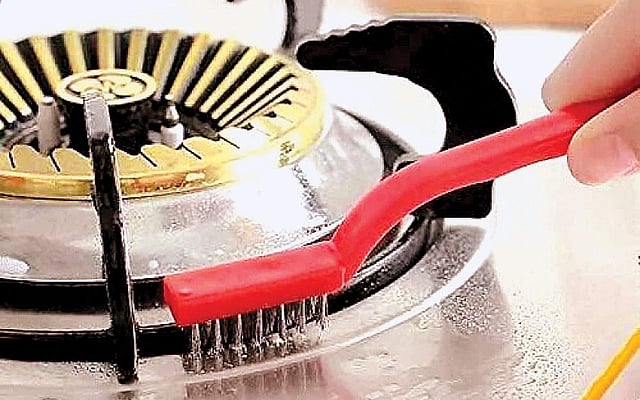 எண்ணெய் பசை படிந்த கேஸ் ஸ்டவ் பர்னர்கள், சிம்னி ஆகியவற்றை சுத்தம் செய்வதற்கு பிரஷை பயன்படுத்தலாம். சமையல் சோடா, சோப்புத் தூள் இரண்டையும் வெந்நீரில் கலந்து பிரஷால் தேய்த்து துடைத்தால் எண்ணெய் பசைகள் நீங்கிவிடும்.