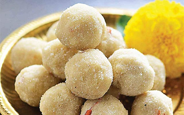 அவல், பொட்டுக்கடலை இரண்டையும் பொடி செய்ய வேண்டும். தேங்காய், முந்திரி, , கிஸ்மிஸ் மூன்றையும் தனித்தனியாக வறுக்க வேண்டும். தேங்காயையும், முந்திரியையும் பொடி செய்து பிறகு எல்லாவற்றையும் மொத்தமாக ஒரு தட்டில் போட்டு கிளறி நெய்யைச் சூடாக்கிவிட்டு கையால் லட்டுவாகப் பிடிக்கலாம்.