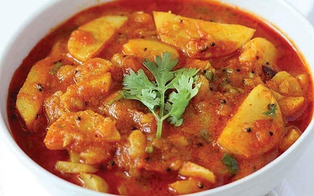 உருளைக்கிழங்கை வேக வைத்து, தோலுடன் பெரிய துண்டுகளாக நறுக்கவும். இஞ்சி, கொத்தமல்லி, பச்சை மிளகாய், உப்பு ஆகியவற்றை சேர்த்து அரைக்கவும். வாணலியில் எண்ணெய், உருளைக்கிழங்கு சேர்க்கவும், அரைத்த விழுது, மஞ்சள் தூள், தனியாத் தூள், சர்க்கரை, பால் சேர்க்கவும், கொதித்ததும் அடுப்பை அணைக்கவும்.