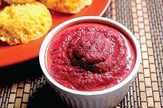 பீட்ரூட்டை தோல் சீவி பொடிப்பொடியாக நறுக்க வேண்டும். வாணலியில் எண்ணெய்விட்டு காய்ந்ததும் உளுத்தம் பருப்பு, கடலைப் பருப்பு, காய்ந்த மிளகாய், பீட்ரூட் துருவல், புளி ஆகியவற்றை போட்டு வதக்கி, தேங்காய்த் துருவல் சேர்க்க வேண்டும். அதில், உப்பு சேர்த்து சட்னியாக அரைக்க வேண்டும்.