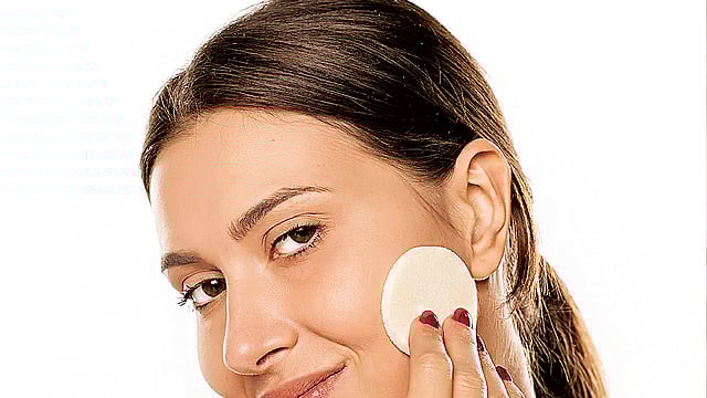 பௌடரில் பஃபை லேசாக ஒற்றி எடுத்து சீராக லேசாக முகத்தில் பூச வேண்டும்.முகத்தில் அழுத்தமாகத் தேய்க்கக் கூடாது.