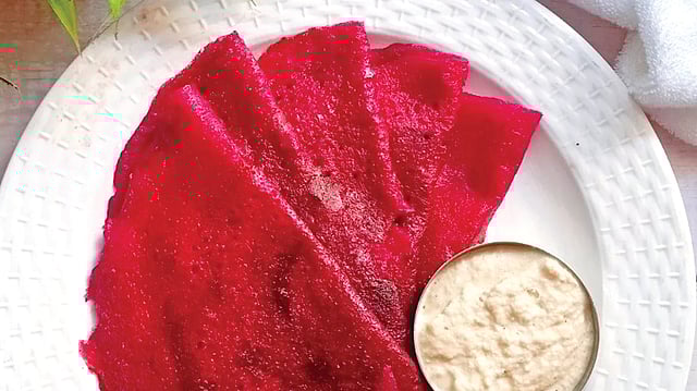 பச்சரிசி, புழுங்கல் அரிசி ஆகியவற்றை இரண்டு மணி நேரம் ஊறவைத்து அரைக்கவும். பின்னர், பீட்ரூட்டை தோல் சீவித் துருவவும். அதனுடன் பெருங்காயம், உப்பு, கறிவேப்பிலை, காய்ந்த மிளகாய் சேர்த்து நன்றாக அரைக்கவும்.