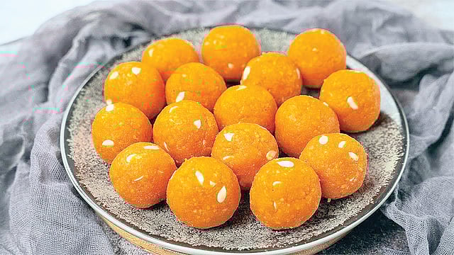 பிறகு வேறொரு பாத்திரத்தில் தண்ணீர் ஊற்றி சர்க்கரை சேர்த்து பாகு காய்ச்சி, மிதமான தீயில் பாகுவை வைத்து அதில் பூந்தி, நெய், முந்திரிப் பருப்பு, ஏலக்காய் தூள் சேர்த்து நன்றாகக் கிளறவும். மிதமான சூட்டில் லட்டு பிடித்துப் பரிமாறவும். சுவையான மோத்திசூர் லட்டு தயார்.