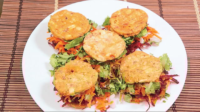 ஒரு பாத்திரத்தில் கேரட், பீட்ரூட், எலுமிச்சைச்சாறு, உப்பு சேர்த்து கலக்கவும். ஆறு தட்டைகளின் மீது கார சட்னியை தடவி தட்டில் இடைவெளிவிட்டு வைத்து அதன் மேல் கொஞ்சம் கொஞ்சமாக கேரட், பீட்ரூட் கலவை வைத்து, அதன் மீது வெங்காயம், கொத்தமல்லி இலை, சாட் மசாலாவை சேர்த்து தூவி தட்டுவடை செட்டில் புதினா சட்னியை தடவி, மாங்காய்த் துருவலைப் போடவும். ருசியான தட்டுவடை செட் ரெடி.