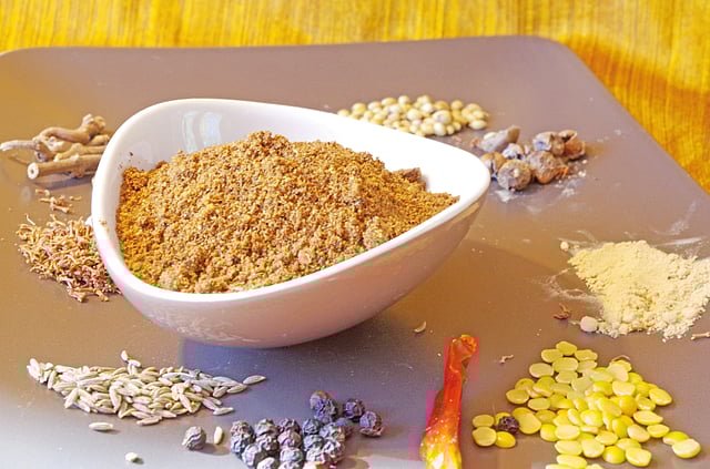வெறும் வாணலியை அடுப்பில் வைத்து, மிதமான தீயில் ஒவ்வொரு பொருளையும் தனித் தனியாக வறுத்து, தேவையான உப்பு, சிறிதளவு பெருங்காயத்தூள் சேர்த்து மிக்ஸியில் பொடித்துக்கொள்ளவும்.