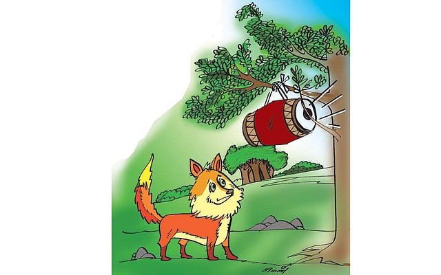 மரத்தில் ஒரு கிளையில் ஒரு பெரிய மேளம் இறுகக் கட்டப்பட்டிருந்தது. அருகில் ஒரு சிறிய கிளை இருந்தது. காற்றின் வேகத்தில் அந்தக் கிளை மேளத்தின் தோல் பகுதியில் அடிக்கடி பட்டது! அதனால் அந்தப் பேரொலி ஏற்பட்டது! இப்போது நரி அந்தப் பெரிய சத்தம் வந்த காரணத்தை அறிந்து கொண்டது!