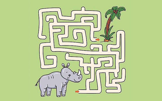 தென்னை மரத்தடிக்குச் செல்ல விரும்பும் காண்டாமிருகம் வழி தெரியாமல் தவிக்கிறது.