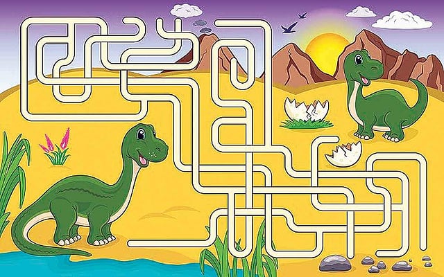 தாய் டைனோசருக்கு, அதனுடைய குட்டி இருக்குமிடத்துக்குச் செல்ல வழிகாட்டி உதவுங்கள்...