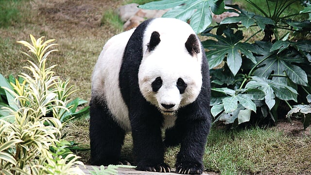 பாண்டாவின் காதுகள், கண் சுற்றுகள், கால்கள் மற்றும் தோல் பட்டைகள் கருப்பு நிறத்திலும் மற்ற பகுதிகள் வெள்ளையாகவும் இருக்கும். இதன் முக்கிய உணவு மூங்கில்.