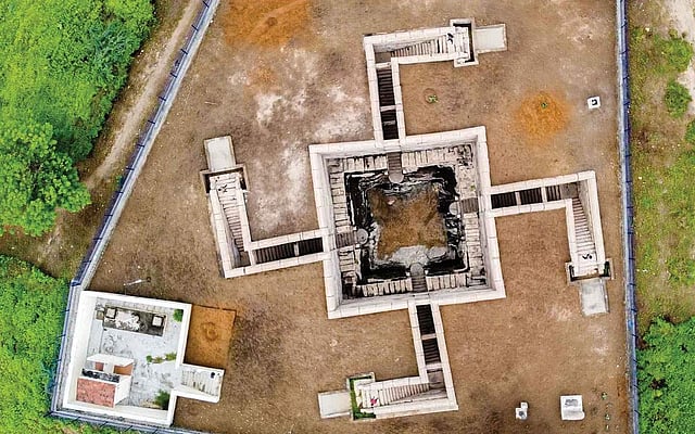 ஒவ்வொரு புறமும் படிக்கட்டு வழியாக இறங்கும் இடத்தில் மேற்புறம் குறுக்குத் தூண்கள் மூன்று காணப்படுகின்றன. இதில் யோகநரசிம்மர், பல்லவமன்னன் நந்திவர்மன் போன்ற உருவம், காளையை அடக்கும் கண்ணன் புள்ளின் வாயை பிளக்கும் காட்சி, சப்தகன்னியர் உமா சகிதரராக சிவபெருமான், தட்சிணாமூர்த்தி, துர்க்கை போன்ற வடிவங்கள் சிற்பங்களாகச் செதுக்கப்பட்டுள்ளன. கிழக்குப்புறத்தூணில் காணப்படும் சிற்பம் இக்கருத்தினை தோற்றுவித்த கம்பன் அரையன் ஆக இருக்கலாம் என கருதத் தோன்றுகிறது. எப்படி இருப்பினும் ஸ்வஸ்திக் வடிவம் உள்ள அமைப்பு புதுமையானது. இதில் காணப்படும் கல்வெட்டுகள் தரும் வரலாற்றுச் செய்திகளால் இக்கிணறு மேலும் பெருமை பெறுகிறது.