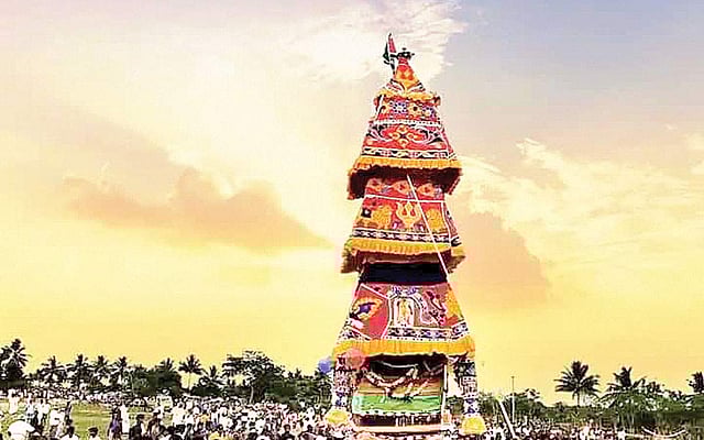 இந்தத் தேரை பக்தர்கள் எங்கும் இறக்காமல் 6 கி.மீ. சுமந்து செல்கின்றனர்.