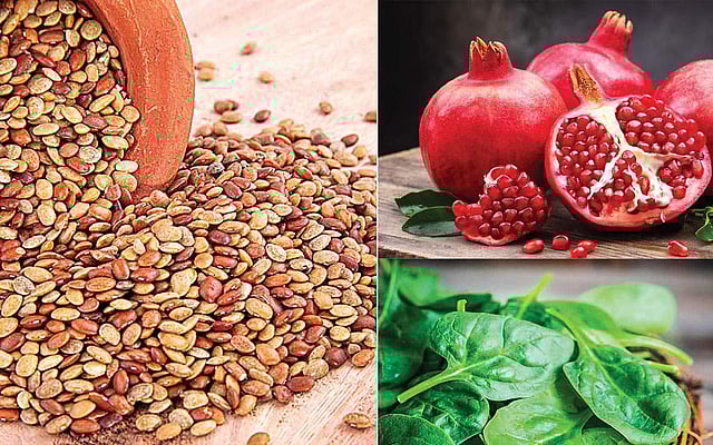 மாதுளையில் பொட்டாசியம் ஏராளமான அளவில் உள்ளன. இதில், நார்ச் சத்து, புரோட்டீன், வைட்டமின் சி, வைட்டமின் கே , ஃபோலேட் சத்துகளும் உள்ளன. அழற்சி எதிர்ப்புப் பண்புகளும் நிறைந்துள்ளன.