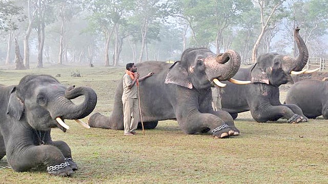 பிரம்மபுத்ராவின் வெள்ளப் பெருக்கு சமவெளிக்குள் அமைந்துள்ளது. குறிப்பிட்ட பருவங்களில் உயரமான இடத்திலிருந்து யானைகள் இடம் பெயர்ந்து வரும். இவை சுற்றுலாப் பயணிகளுக்கு கண்கொள்ளாக் காட்சியாக இருக்கும். இங்கு 1,920 யானைகளுக்கும் மேல் உள்ளன. ஒற்றைக்கொம்பு காண்டாமிருகங்களுக்கும் பிரபலம். புலிகள், நீர் எருமைகளும் அதிகம்.