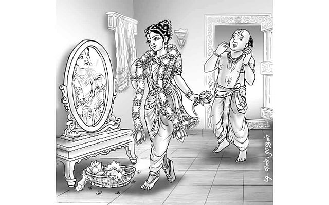 திருமாலுக்கு எனத் தொடுத்த மாலையை அவள் அணிந்து பார்த்த செயலை மட்டும் பதிவுசெய்ய மனமின்றித் தவிர்த்து விடுகிறார். ஆனால் ஆழ்வாரின் இந்தப் பாடலைப்படித்த கவிச்சக்கரவர்த்தி கம்பருக்கு, "அவள் மாலை சூடிநின்ற அழகும்' சேர்ந்தே மனக்கண்ணில் தோன்றியிருக்கக் கூடும்.
