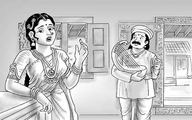 தலைவியின் இல்லம் சென்ற பாணன், தலைவனைப் பலவாறு புகழ்ந்து பேசிக்கொண்டே இருந்தான். தலைவியால் அதனை ஏற்றுக்கொள்ள முடியவில்லை. அச்சூழலில் பின்வருமாறு பாணனைப் பார்த்துக் கூறுகிறாள்: