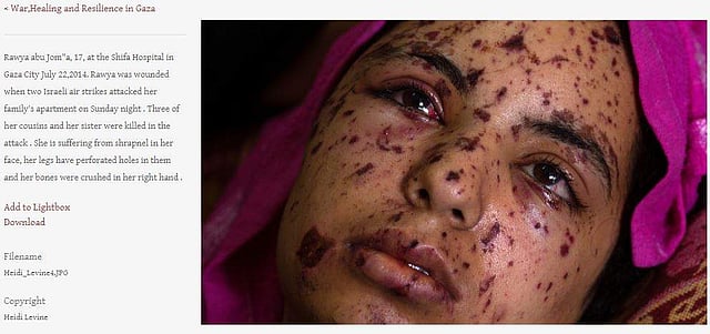 அந்த வகையில் 2014-ஆம் ஆண்டு பாலஸ்தீனத்தின் மேற்கு கரை நகரான காஸாவில், இஸ்ரேல் தாக்குதலுக்கு உள்ளான பல பகுதிகளை புகைப்படங்கள் எடுத்தார். அதில் அங்கு குண்டு தாக்குதலுக்கு பலியான ரவ்யா அபு ஜோம் என்ற பெண்ணின் புகைப்படமும் ஒன்று.தாக்குதலில் கோரத்தினை காட்டுவதாக அந்தப் படம் அமைந்திருந்தது.